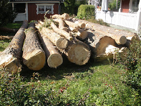 Och visst, vi är Familjen Annorlunda. Medans andra satsar på pooler, fina utegrupper, lusthus och studsmattor i sina pedantiskt skötta trädgårdar så staplar vi timmer, som ska bli en eller flera handgjorda små ekor så småningom. Till detta projekt är dock jag en aningens skeptisk, och undrar naturligtvis när Rudolf kommer ha tid/ork med detta.