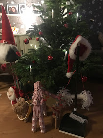 Stella lade ner mycket arbete på att även tomtar, halmgrisen, halmbocken och sopskyffeln fick lite välbehövligt pynt på sig. Vadå, har inte eran sopskyffeln tomteluva på sig framför granen?